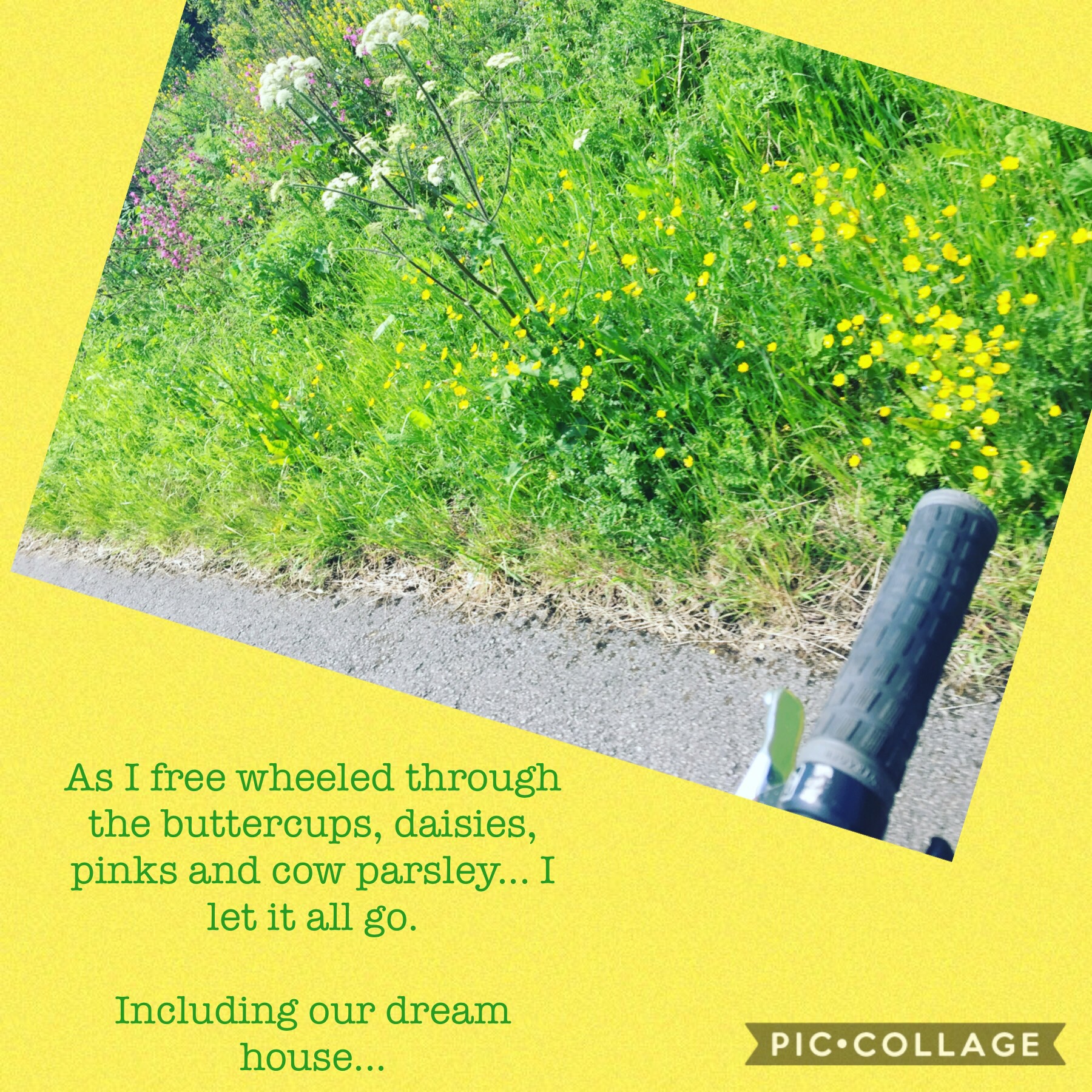 It was only on the bike ride home from pilates, that as I free wheeled through the buttercups, daisies, pinks, spring grasses and cow parsley, I let it all go. The anxiety, the tension, the smack … and the dream house.
