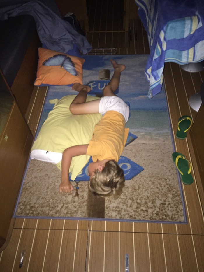 The further along the holiday, the more relaxed we have become and the days have merged into one; lazy breakfast, quick swims, a sail to a beautiful bay, a swim, a lunch that my mother in law and I have nailed to a tee to prepare, a snooze, a swim, a sail, a swim, 6 o'clock sundowners and nibbles, a hose down al fresco and local simple tavern supper and house wine….. while the boys settle below, we take tea above board, with a square of chocolate and a sip of metaxa … and as I cool off under the stars, listening to gentle Greek tunes and tapping of the waves, I know my last and final part of my daily routine is to pick up Willy who has decided the coolest and comfiest place to sleep is in the middle of the boat on the rug that sums up the holiday….